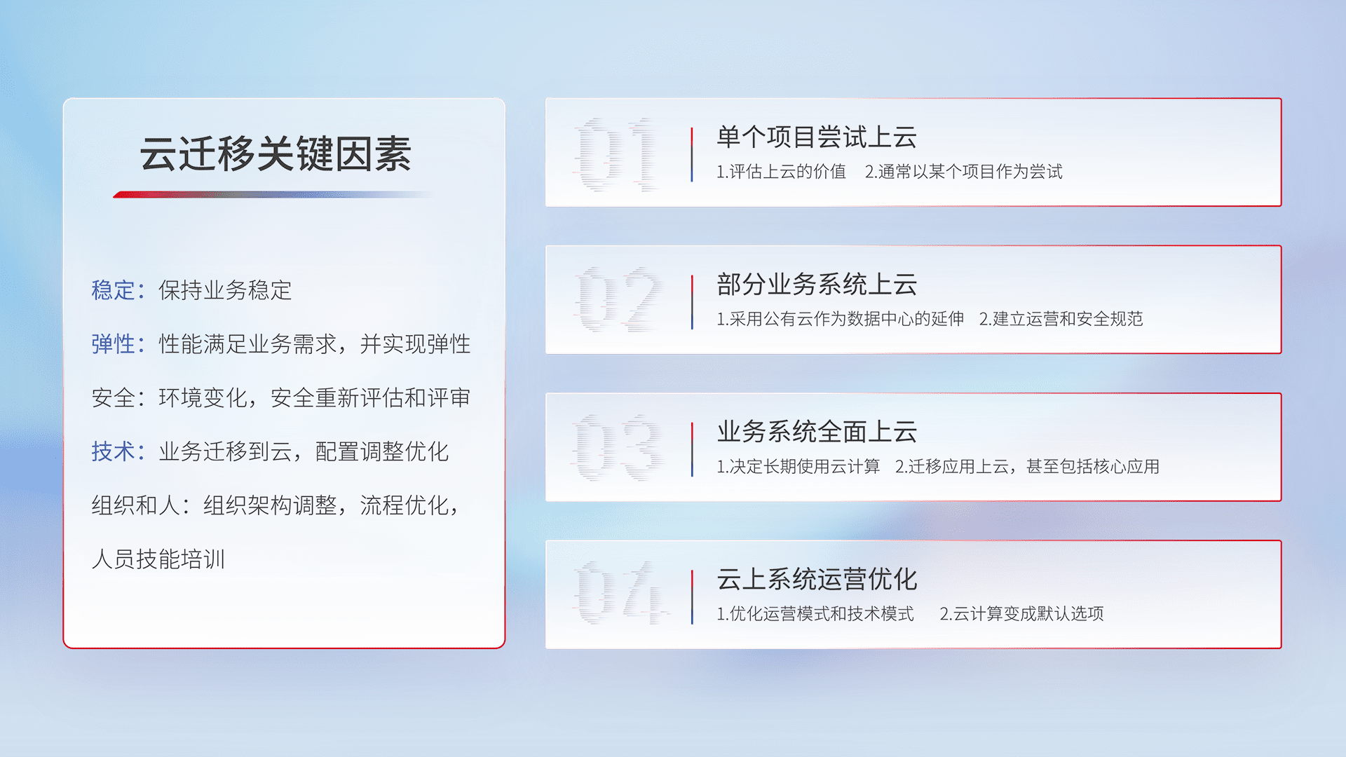 结合实际业务,,,,从规划设计、、云平台选型、、、云原生改造、、、数据迁移、、、集成交付,,,,迁移全过程为客户识别最佳上云路径,,,,做好风险识别管理,,设计网络架构、、、、身份权限、、、、安全审计合规、、、操作审计、、日志审计、、、监控告警策略、、、、多站点容灾设计等,,,对云上基础设施进行整体规划,,,提升IT治理水平,,,以满足弹性、、、、高可用、、、、高性能的需求。。。。